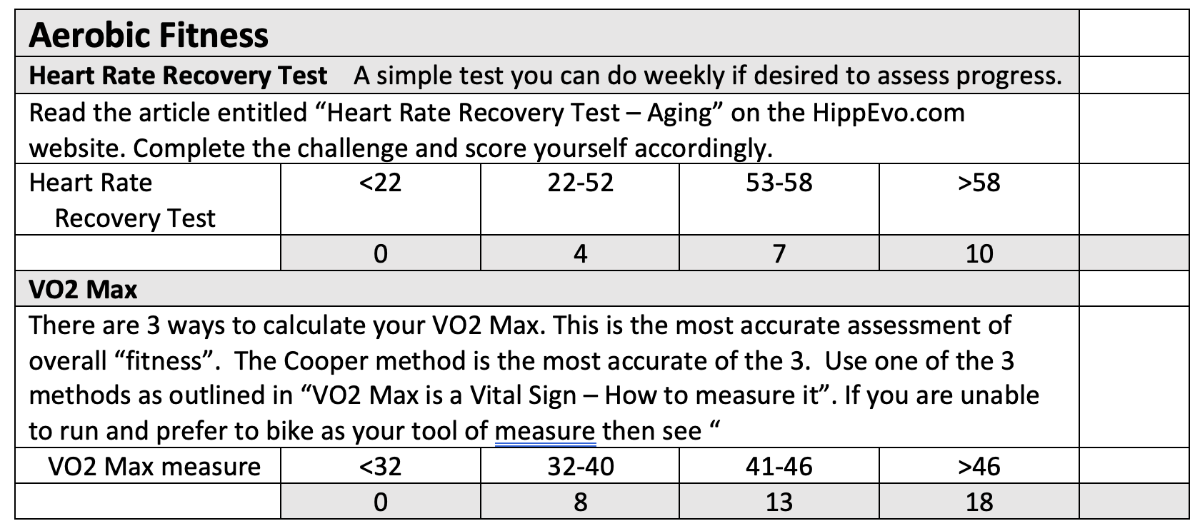 There are 6 challenges listed below to test your overall aerobic fitness and your general strength. The total of those 6 scores will help guide your understanding of your overall fitness and allow you to adjust your exercise regimen to optimize health and longevity. What gets measured gets done.
